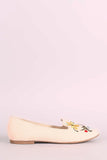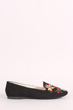 This pretty slip on loafer flat features a rounded toe, embroidered floral design at front vamp, and lightly padded insole.
