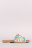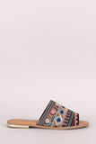 These open toe slide sandals features a vegan suede with an embroidery tribal design, slight metallic-trim heel, and lightly cushioned insole.